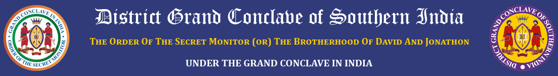 Welcome to the web site of District Grand Conclave of Southern India under the Grand Conclave in India or the Order of Secret Monitor or Brotherhood of David and Jonathan in India. Its ceremonials are based on the Old Testament story of the lifelong friendship between David and Jonathan. The Order has been present in India for more than 125 years until recently, under the Order of the Secret Monitor or Brotherhood of David and Jonathan in the British Isles and its Districts and Conclaves Overseas.